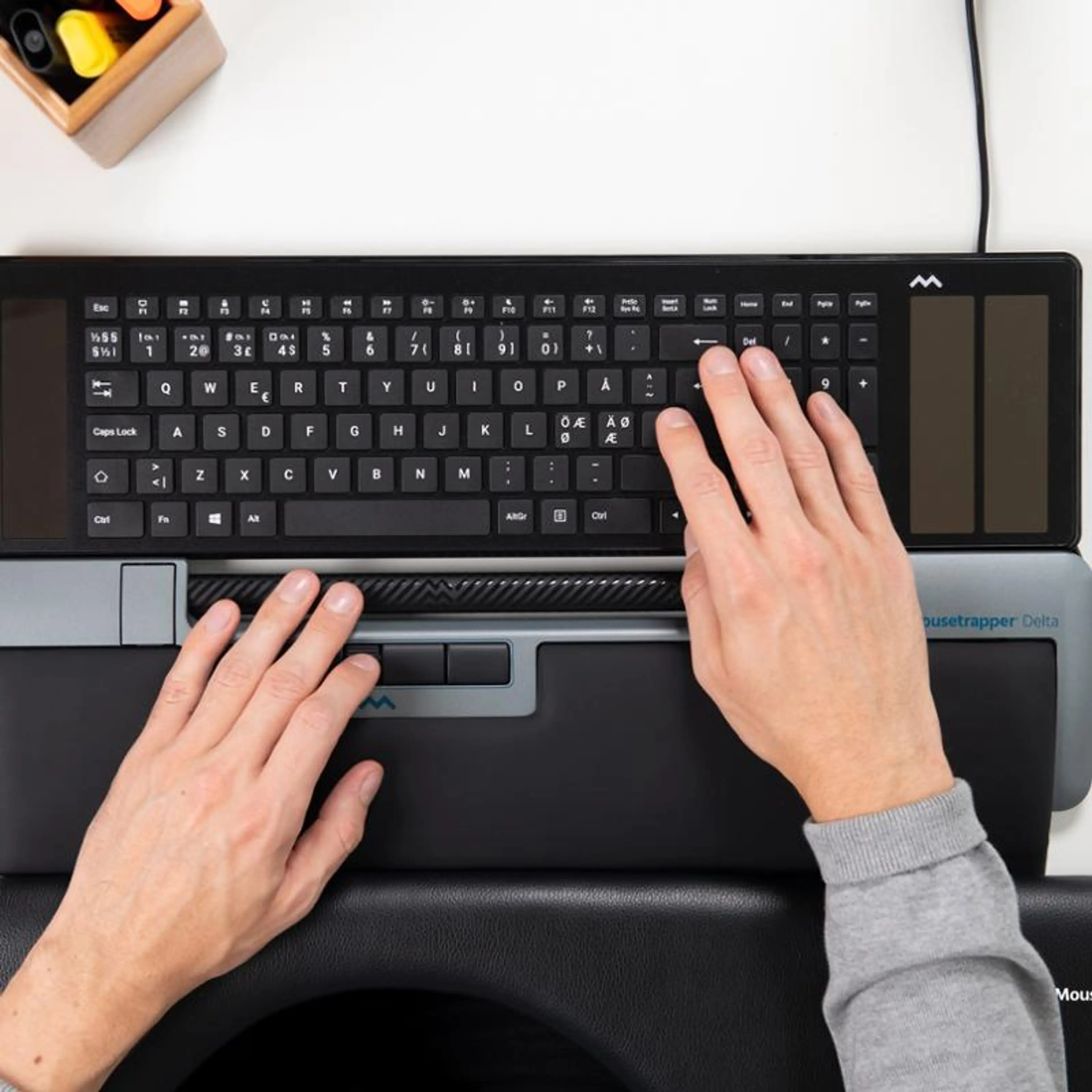 Mousetrapper er plassert midt foran tastaturet. Dette gir det en ergonomisk sunn arbeidsstilling der du holder armene nær kroppen og hendene nær tastaturet.