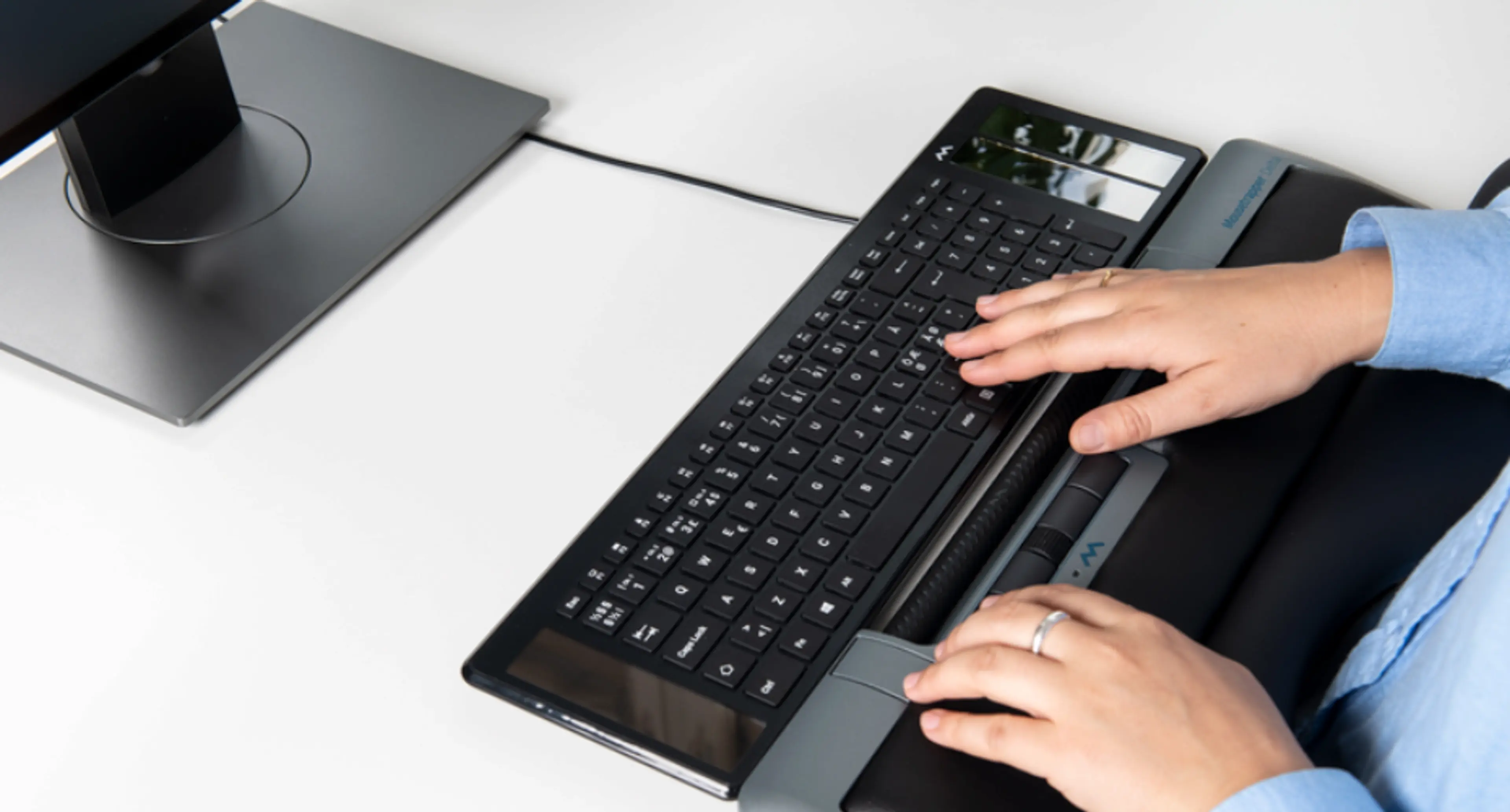 Det gjør at du unngår, og i mange tilfeller lindrer, belastningsskader som kan oppstå når du strekker armen for mye slik du gjør med en vanlig mus. Du trenger ikke lenger å strekke deg bortenfor tastaturet når du bruker musen. De brede, polstrede håndleddstøttene avlaster også nakke, skuldre, armer og håndledd.